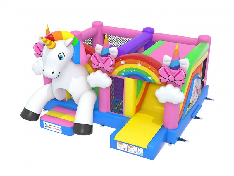Het magische Unicorn springkasteel met obstakelbaan en regenboog glijbaan - een betoverend avontuur voor kinderen vol plezier en fantasie!